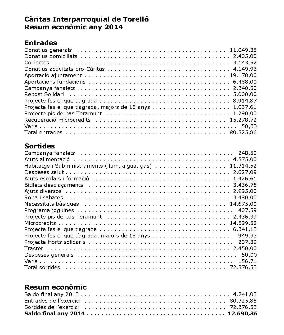 Aquest és l’estat de comptes de Càritas Interparroquial a 31 de desembre de 2014.